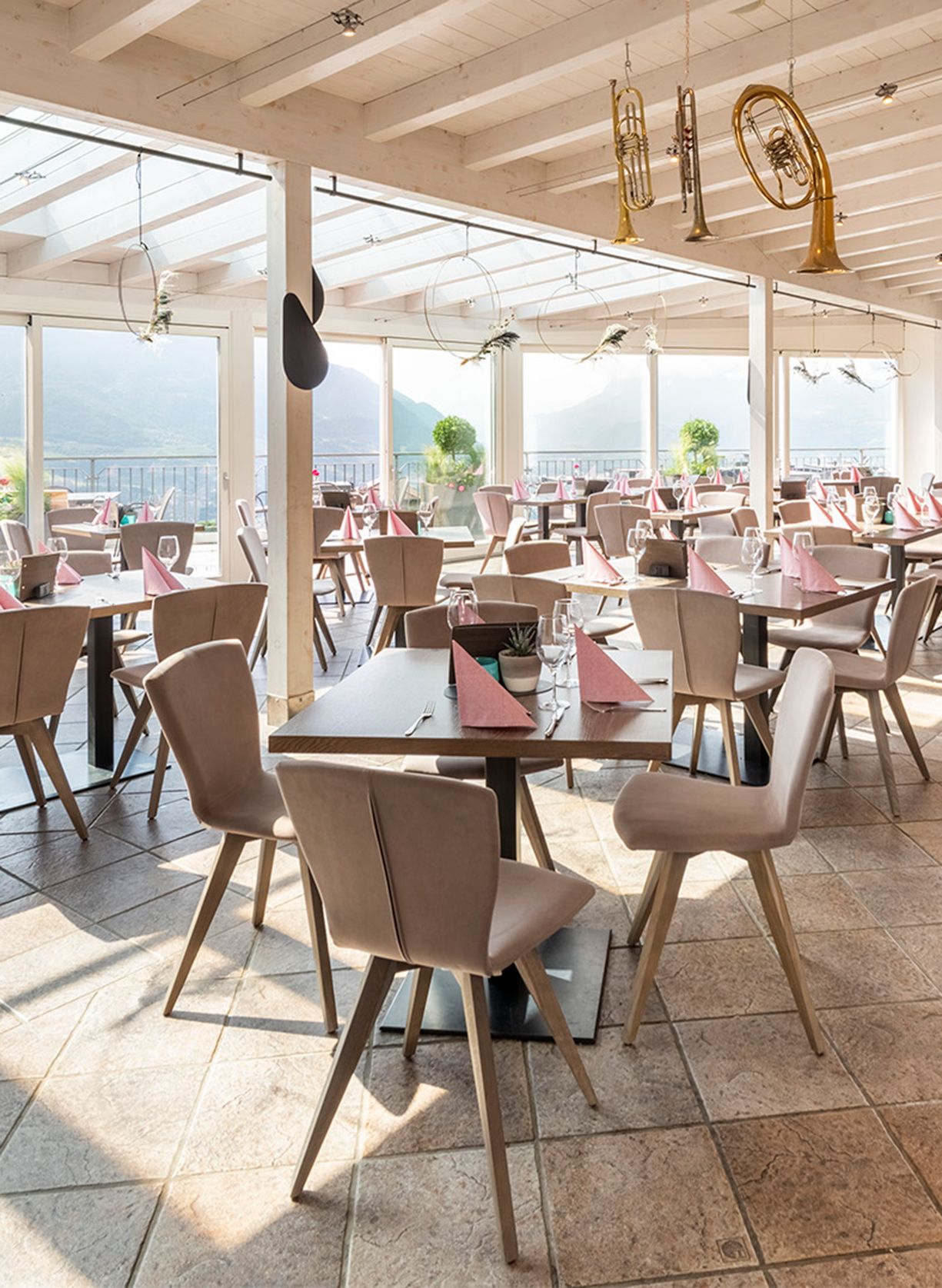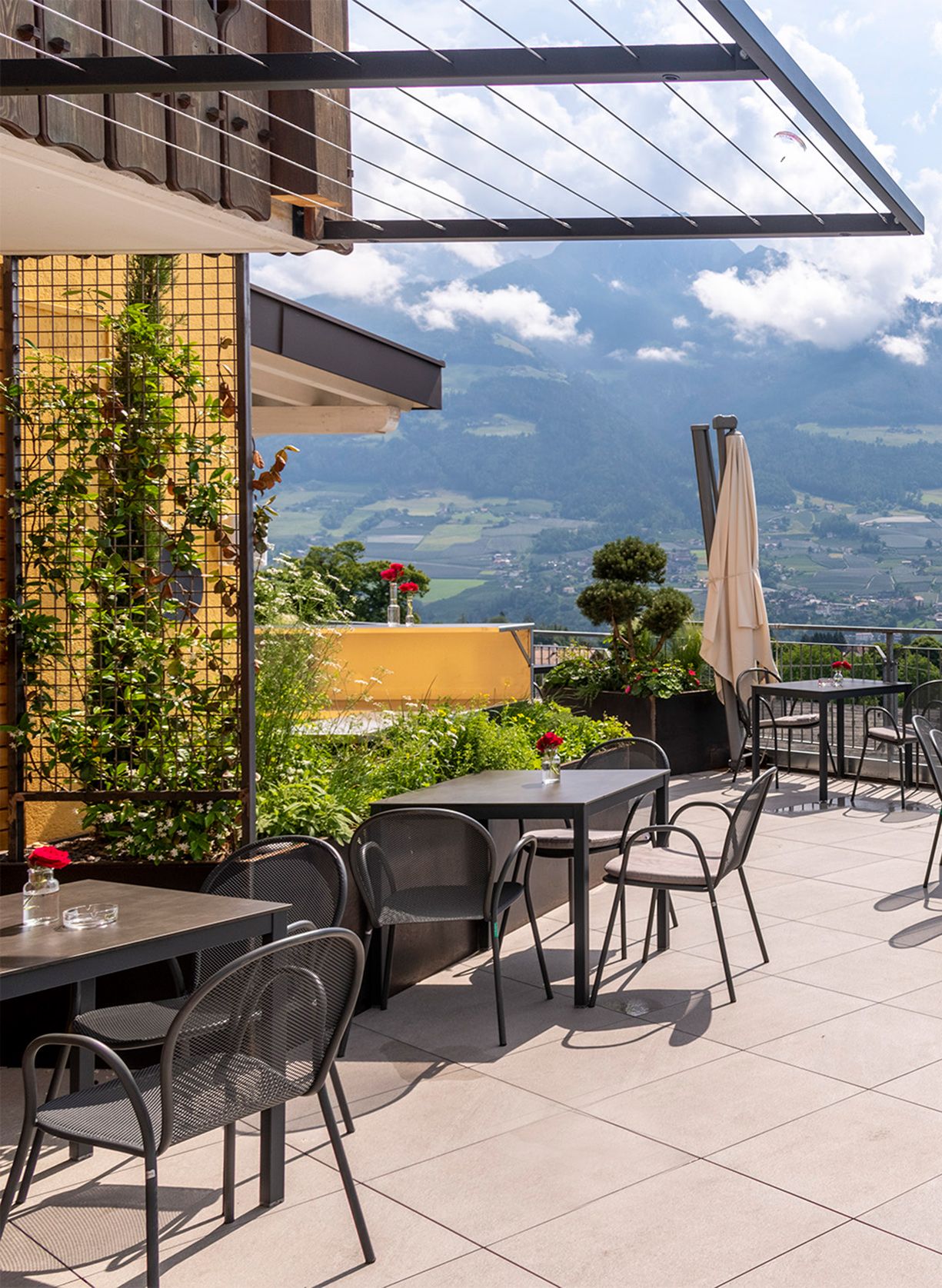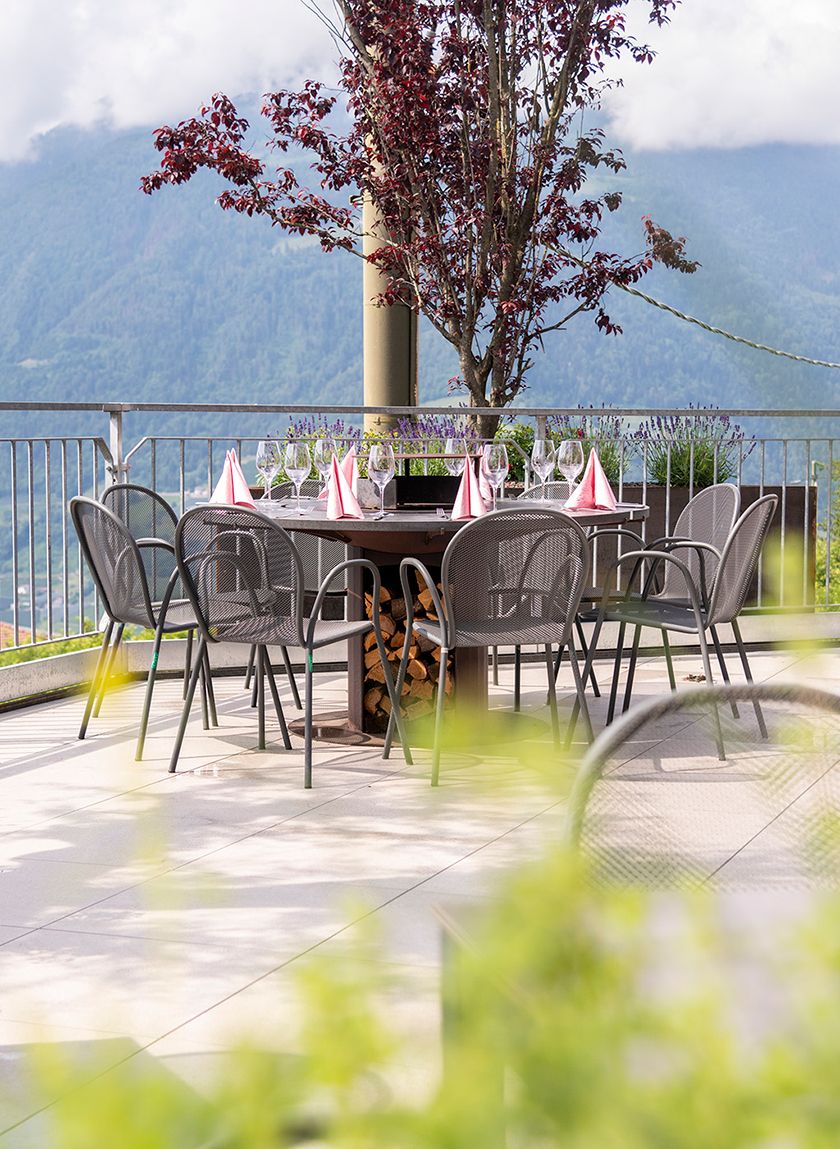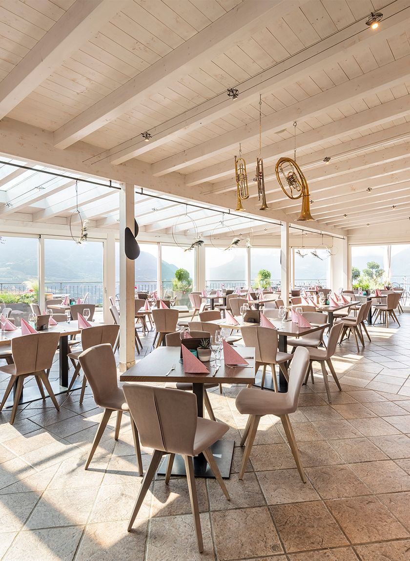 Unser Restaurant bietet Ihnen Raum zum Genießen – drinnen wie draußen. Die große Panoramaterrasse mit Blick auf Meran und das Etschtal ist unser Herzstück: lichtdurchflutet, windgeschützt und auch bei schlechterem Wetter ein gemütlicher Ort für gesellige Stunden. Wer es ruhiger mag, findet in unserer heimeligen Bar mit gemütlichen Tischen Platz für entspannte Gespräche im kleinen Kreis. Ob Familienfeier, Feierabenddrink oder romantisches Dinner – unser Ambiente passt sich Ihren Wünschen an und sorgt für echte Wohlfühlmomente.